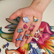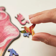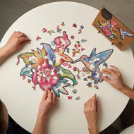 Visit a tropical forest on the wings of the Elusive Colibri. We lured her into our collection with the help of the second half of the puzzle — a bright flower, which is assembled separately. So that a fast bird does not slip away from you, you will need to combine dozens of butterflies, flowers, and birds into one amazing composition. And even if it seems complex and hard, you'll find this puzzle to be as light as Colibri herself. Also, remember that our puzzles are made of the highest quality sustainable material. So no animals were harmed in the creation of the Elusive Colibri and her flower.