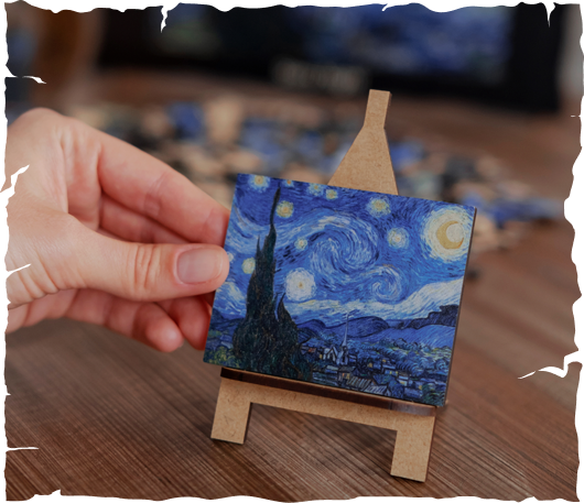 The puzzle has a premium-quality packaging: a lacquered wooden box and a craft paper with Van Gogh’s drafts and sketches. Each box contains a mini-easel with a copy of the painting — your clue for assembling the puzzle.